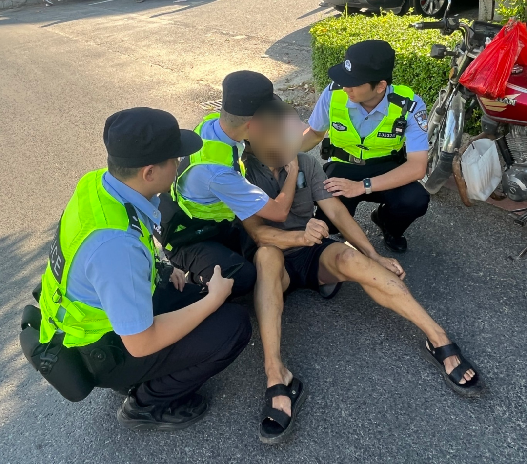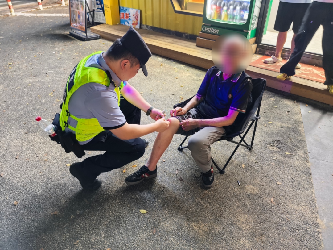 近日,惠东公安轮训队沿海执勤警员在亚婆角维港湾巡逻期间,发现一名老人不慎跌倒,警员们立即上前搀扶并详细了解伤情,并小心翼翼地对其额头和膝盖处的伤口进行止血消毒。