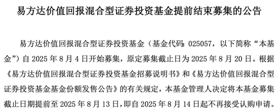8月9日,易方达价值回报混合基金率先发布提前结募公告称,基金自8月4日开始募集,原定募集截止日为2025年8月20日,根据有关规定,公司决定将募集截止日提前至8月13日,8月14日起不再接受认购申请。