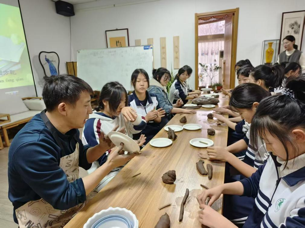 随后,师生造访山东省工艺美术大师、琉璃镌刻非物质文化遗产代表性传承人阚方乾老师的工作室。阚老师分享了自己的艺术心得,强调了“手”与“心”在工艺创作中的同等重要性。在实践环节,他亲自演示了传统陶艺技法——泥条盘筑,从泥性处理到盘筑塑形的每一步都细致讲解。学生们在大师的近距离指导下,亲手将一团团陶泥搓揉、盘绕,逐渐塑造成形态各异的坯体。整个工作室充满了专注而活跃的动手氛围,同学们在实践中不仅体验了技艺,更感受到了专注与耐心的工匠精神。